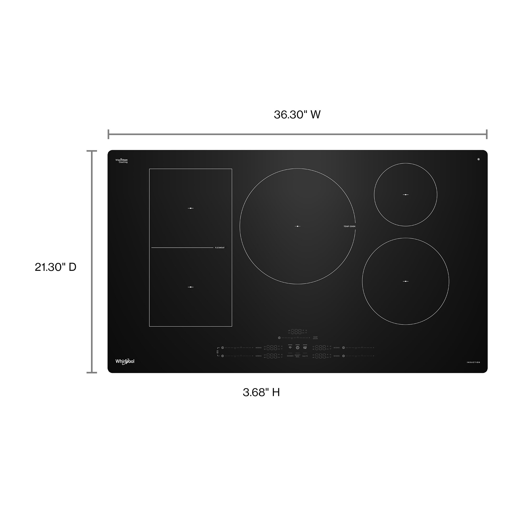 36" Intelligent Induction Cooktop with Temp Cook™ Technology and WipeClean™ CoatingThe Whirlpool Intelligent Induction Cooktop helps you stay on time of meal time even with life's interuptions. Temp Cook™ Technology helps you avoid burning with dual temperature sensors that monitor and maintain your heat. Smart Presets like simmer, saute, and more put favorites at your fingertip and the Flexheat™ Plus Element matches your heat to your pan size. Voice Control allows you to do so hands-free with Alexa™ or Google™ when connected and WipeClean™ Coating simplifies cleanup so you can wet, wait, and wipe away the mess after meals.