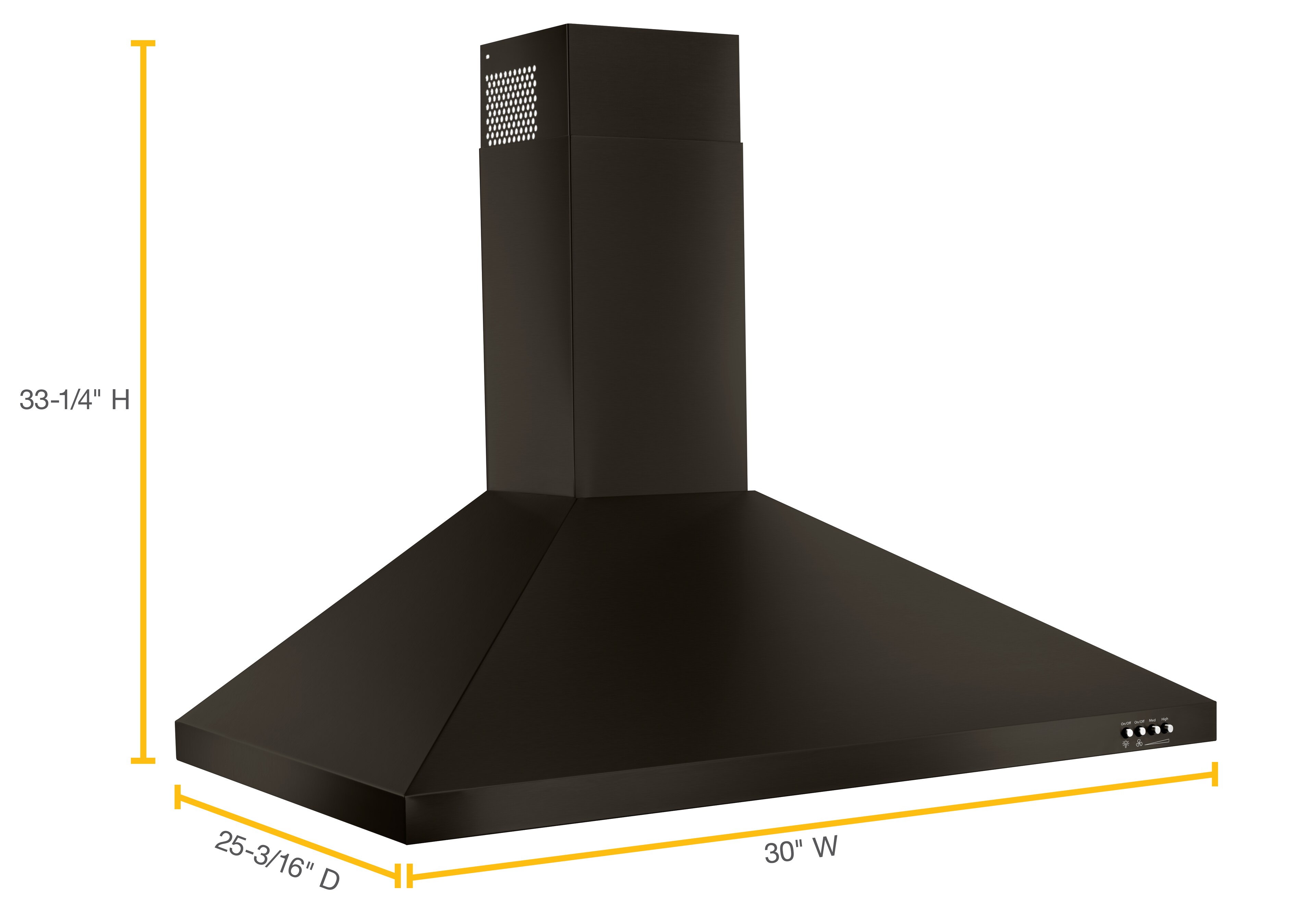 30" Contemporary Black Stainless Wall Mount Range HoodAdd a contemporary look to your kitchen with this black stainless wall mount kitchen hood featuring bright, long-lasting LED task lighting. You'll have the right amount of ventilation for all of your cooking thanks to the 3-speed, 400 CFM motor class. A grease filter helps traps unwanted grease and odors. And depending on your kitchen ventilation system setup, you can vent vapors and odors outside or filter them and recirculate the air thanks to the range hood's convertible ventilation. When venting at low speed, sound levels can get as low as 44 dBA.