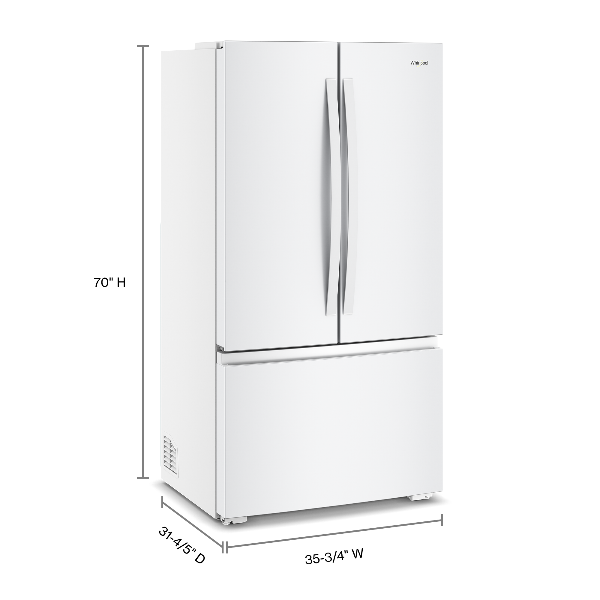 36-inch Wide True Counter Depth 3-Door French Door Refrigerator - 24 cu. ft.Maximize organization and minimize clutter with 5 organizational zones in this large capacity Whirlpool® True Counter Depth French Door Refrigerator. Get filtered water at the push of a button with a hidden Interior Filtered Water Dispenser. Keep everything in sight with Panoramic LED Lighting and shift between temperature settings and store wine, deli items, meat and more with Flexible Temperature Drawer.