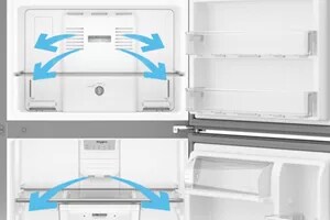 With Total Coverage Cooling, multi-flow vents direct fresh, chilled air throughout the refrigerator to help keep an even temperature at every shelf.