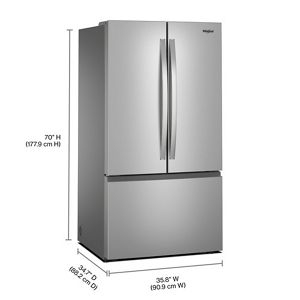 36-Inch French Door Refrigerator with Ice Maker - 31 cu. ft.Get Family-Sized capacity with the Whirlpool® 31 cu. ft. French door refrigerator. Large Capacity Ice Production makes over 3 lbs of ice every day. Pint Size storage provides easy access to small items. And flexible storage with half and full Adjustable Glass Shelves.