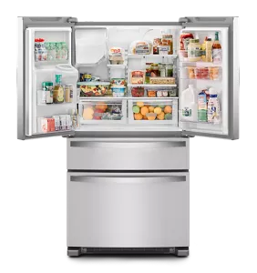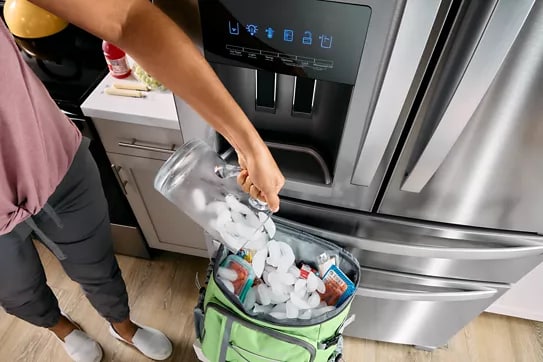 No French Door Bottom Mount Refrigerator in-door ice maker holds more ice. With 3.7 lbs, your ice maker keeps up with your family.
