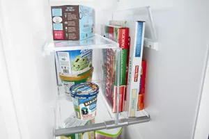 Easily store frozen pizzas upright without trying to fit them on flat freezer shelves. When the last of the frozen pizza is gone, this adjustable shelf can be folded down so you can store and still find smaller frozen items.