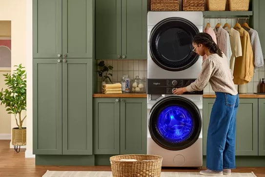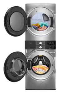 Save space and easily reach the centralized control panel with a front load laundry tower configuration