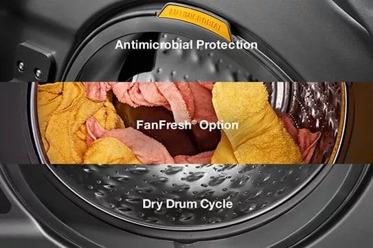 The FreshFlow™ Vent System, now with UV Clean Technology, keeps your clothes and machine fresh and clean. It includes the Dry Drum Cycle, FanFresh® Option, Antimicrobial protection, and industry-first UV Clean Technology.