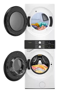 Save space and easily reach the centralized control panel with a front load laundry tower configuration