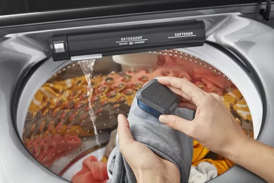 Add detergent, bleach and fabric softener to their designated compartments so each gets dispensed at just the right time during the cycle.